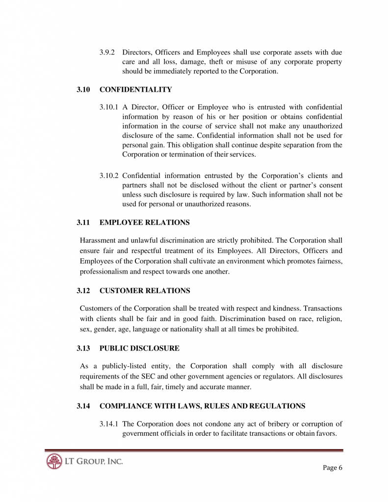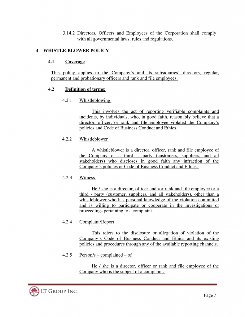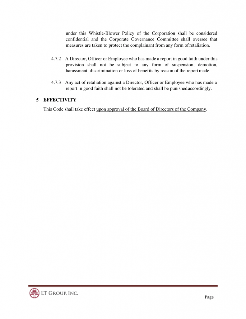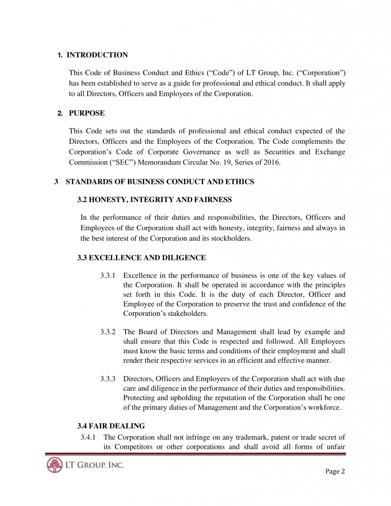 This Code of Business Conduct and Ethics (“Code”) of LT Group, Inc. (“Corporation”) has been established to serve as a guide for professional and ethical conduct. It shall apply to all Directors, Officers and Employees of the Corporation