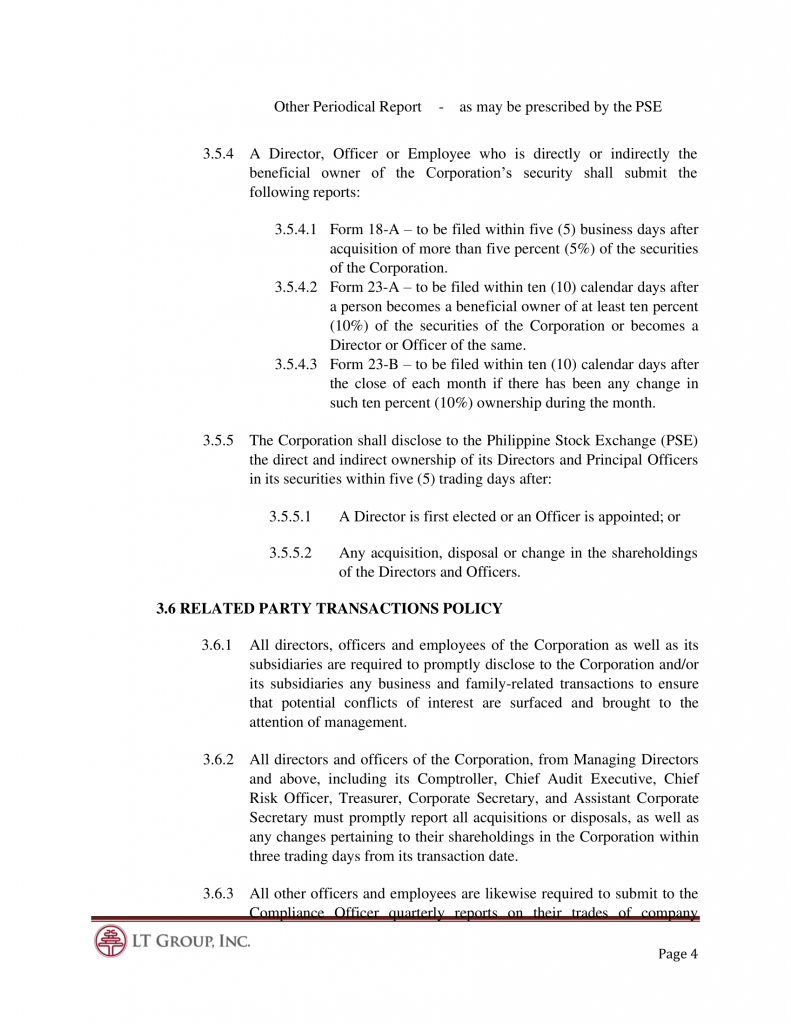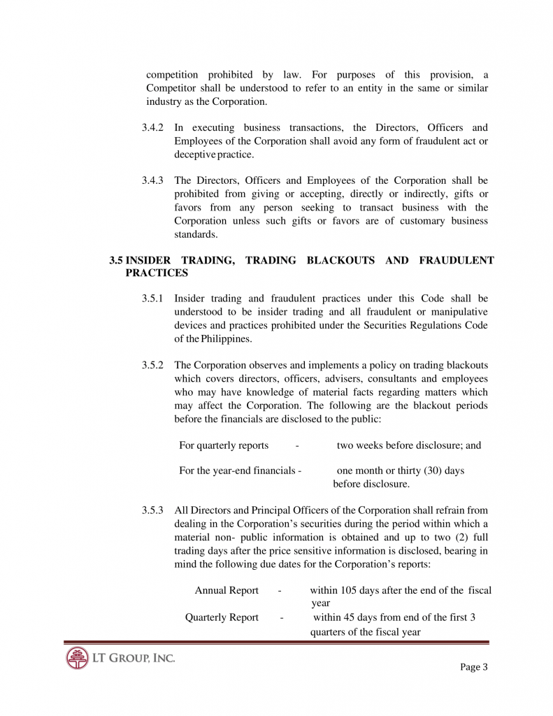 3.4.3 All Directors and Principal Officers of the Corporation shall refrain from dealing in the Corporation’s securities during the period within which a material nonpublic information is obtained and up to two (2) full trading days after the price sensitive information is disclosed, bearing in mind the following due dates for the Corporation’s reports: