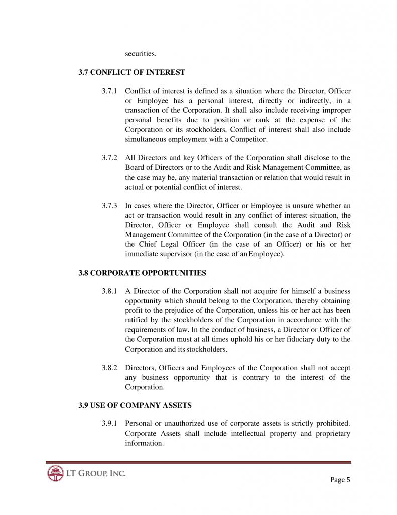 3.6.2 All Directors and key Officers of the Corporation shall disclose to the Board of Directors or to the Audit and Risk Management Committee, as the case may be, any material transaction or relation that would result in actual or potential conflict of interest.