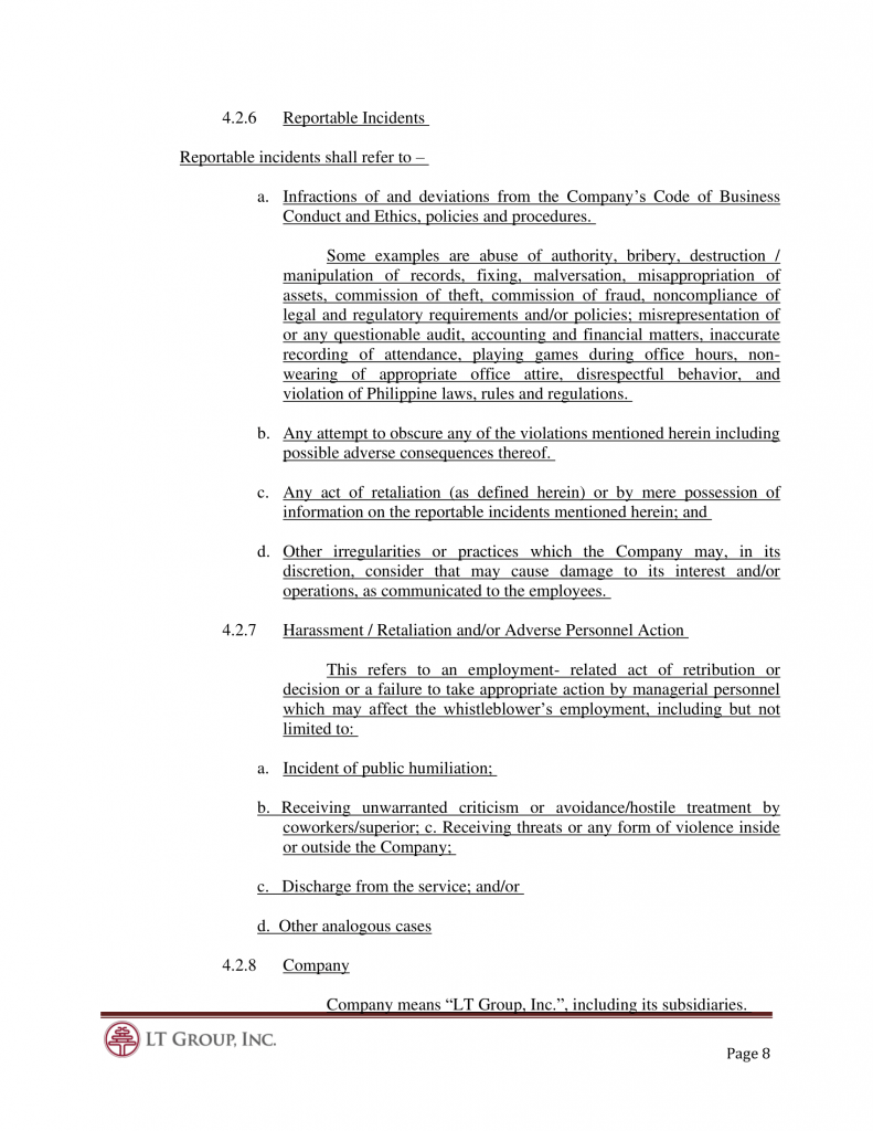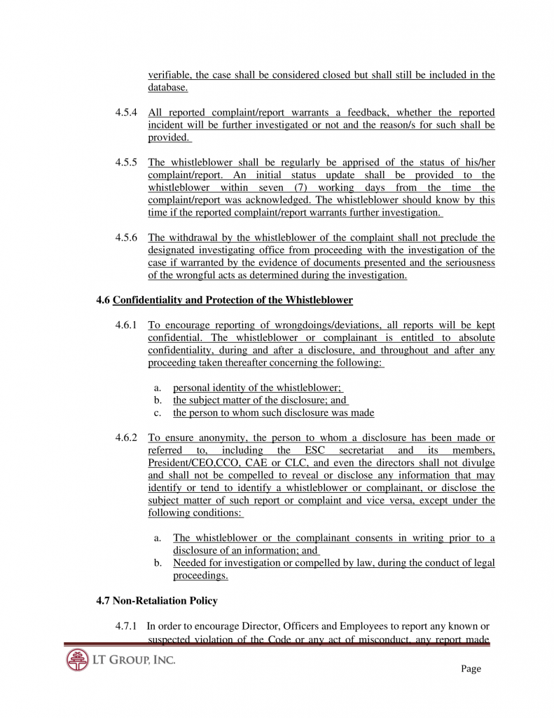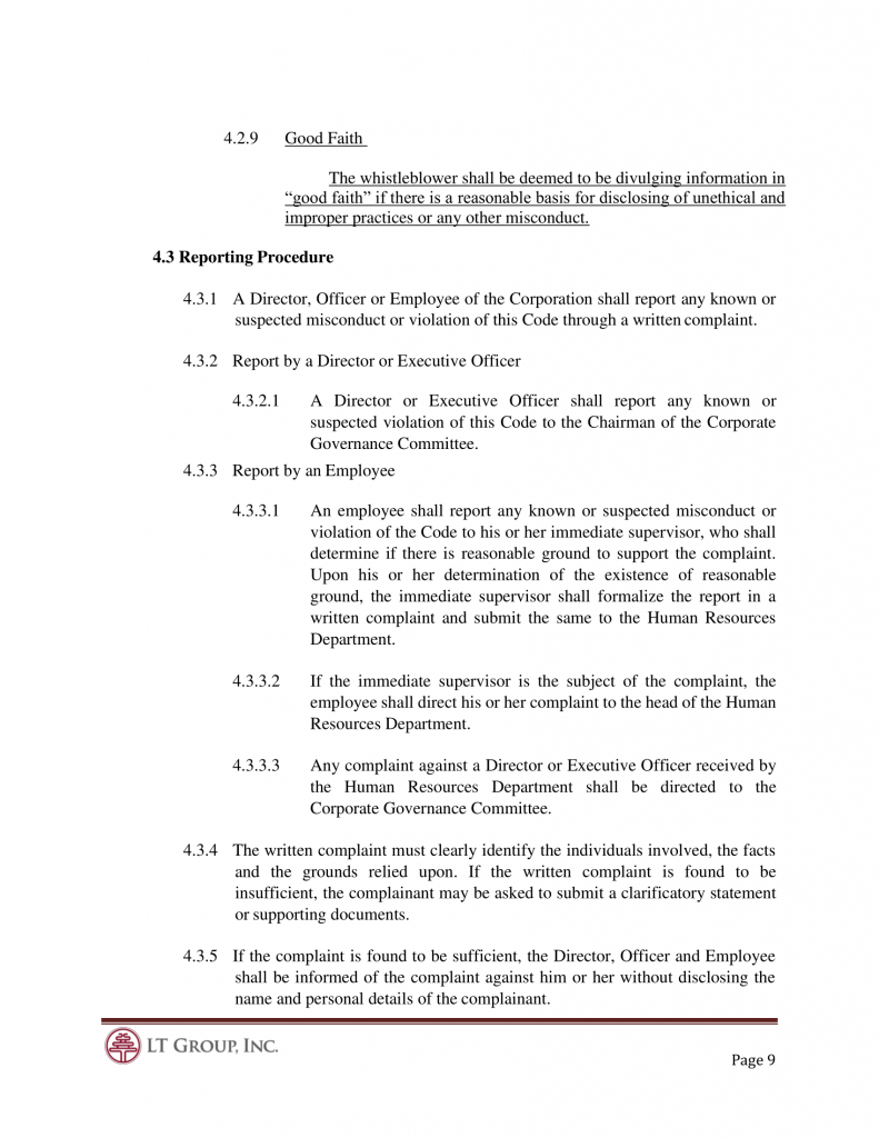 4.3.1 In order to encourage Director, Officers and Employees to report any known or suspected violation of the Code or any act of misconduct, any report made under this Whistle-Blower Policy of the Corporation shall be considered confidential and the Corporate Governance Committee shall oversee that measures are taken to protect the complainant from any form of retaliation.