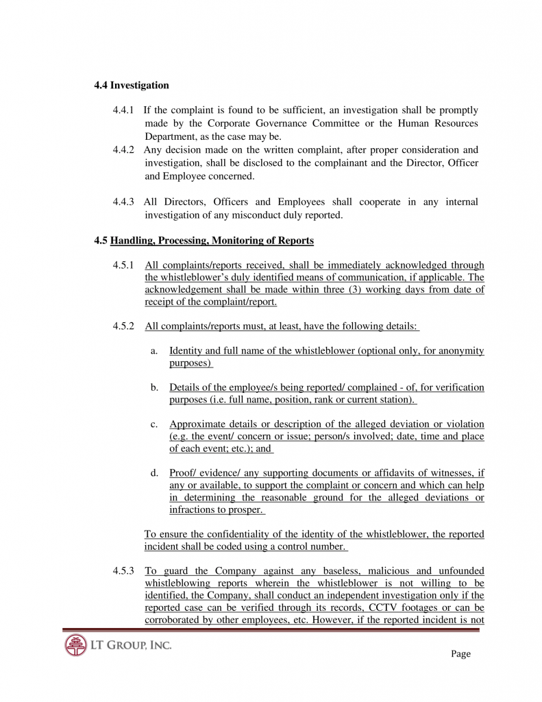 4.2.1 If the complaint is found to be sufficient, an investigation shall be promptly made by the Corporate Governance Committee or the Human Resources Department, as the case may be.