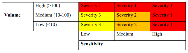 Taking into consideration both the volume of records and the sensitivity of the records affected by an event or incident, the following matrix is used to determine the overall severity of the incident, with Severity 1 incidents being most serious, to Severity 3 incidents having the lowest rating: