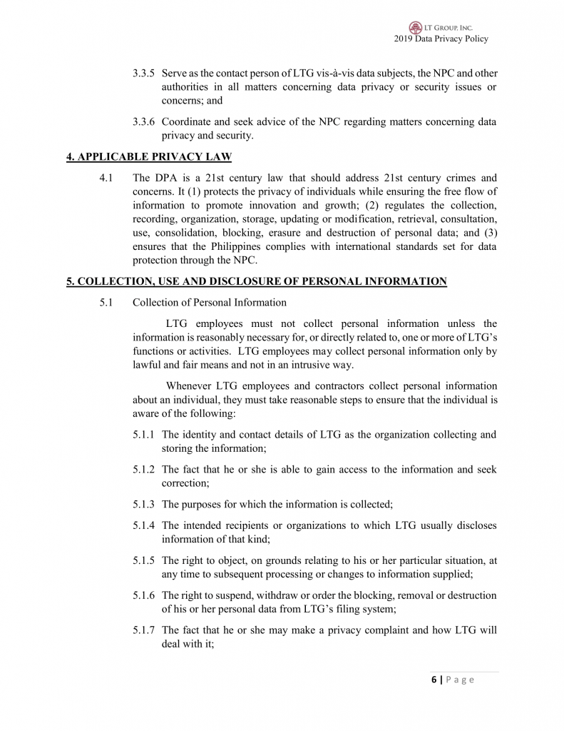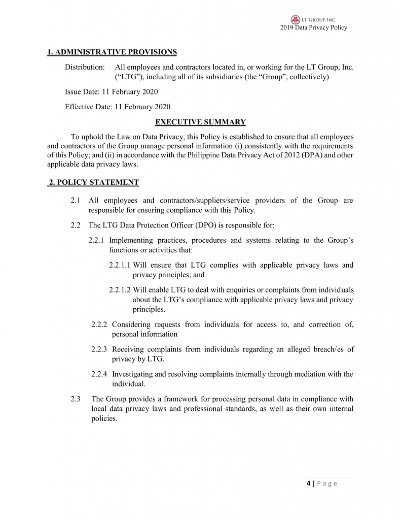 To uphold the Law on Data Privacy, this Policy is established to ensure that all employees and contractors of the Group manage personal information (i) consistently with the requirements of this Policy; and (ii) in accordance with the Philippine Data Privacy Act of 2012 (DPA) and other applicable data privacy laws.