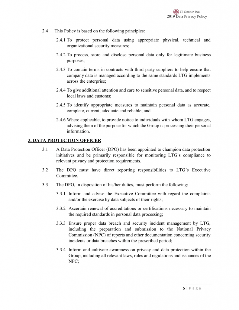 3.1 A Data Protection Officer (DPO) has been appointed to champion data protection initiatives and be primarily responsible for monitoring LTG’s compliance to relevant privacy and protection requirements.