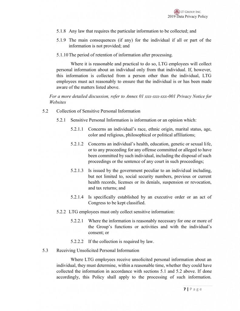 5.2.2 LTG employees must only collect sensitive information: