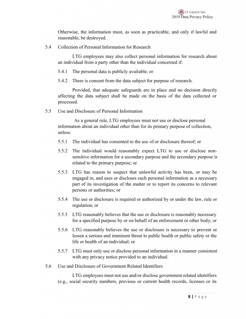 Where LTG employees receive unsolicited personal information about an individual, they must determine, within a reasonable time, whether they could have collected the information in accordance with sections 5.1 and 5.2 above. If done accordingly, this Policy shall apply to the processing of such information. Otherwise, the information must, as soon as practicable, and only if lawful and reasonable, be destroyed.