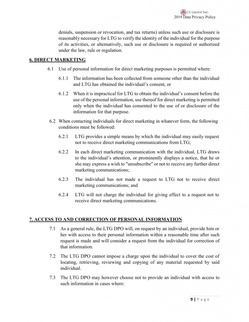 6.1.2 When it is impractical for LTG to obtain the individual’s consent before the use of the personal information, use thereof for direct marketing is permitted only when the individual has consented to the use of or disclosure of the information for that purpose.