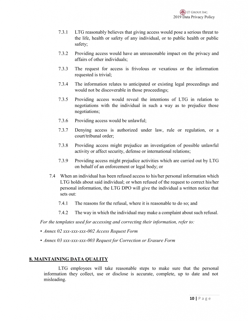 7.4 When an individual has been refused access to his/her personal information which LTG holds about said individual; or when refused of the request to correct his/her personal information, the LTG DPO will give the individual a written notice that sets out: