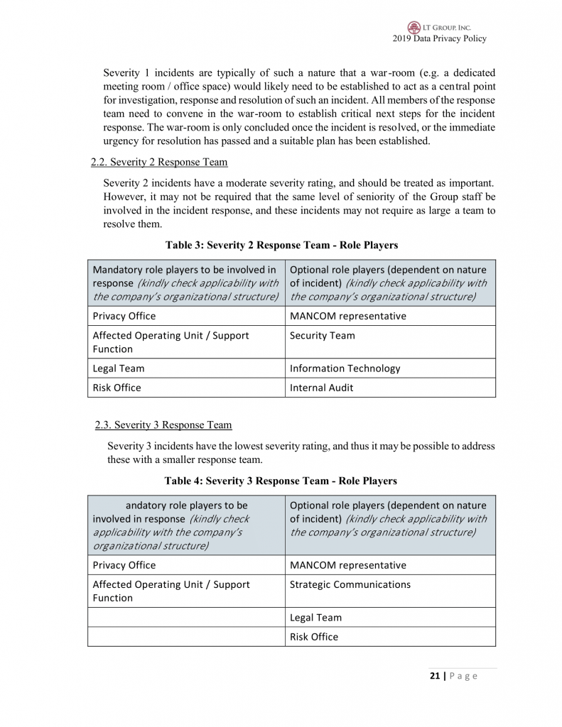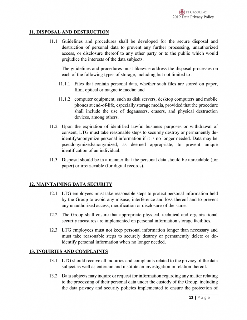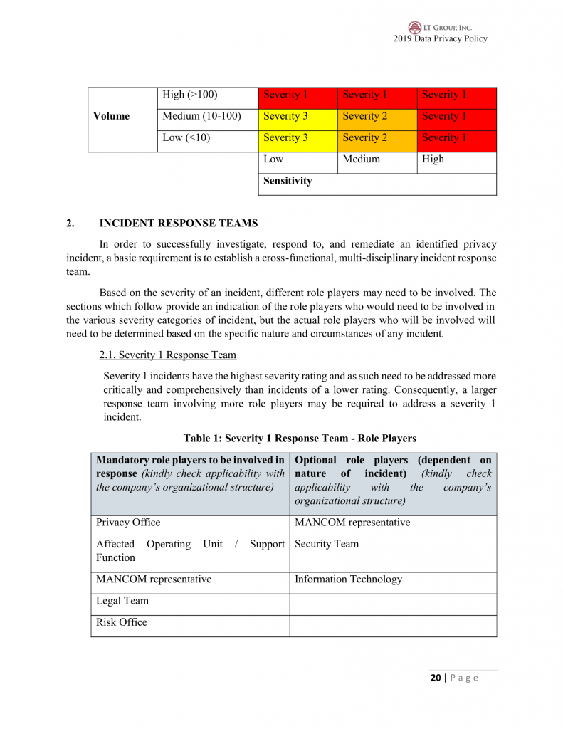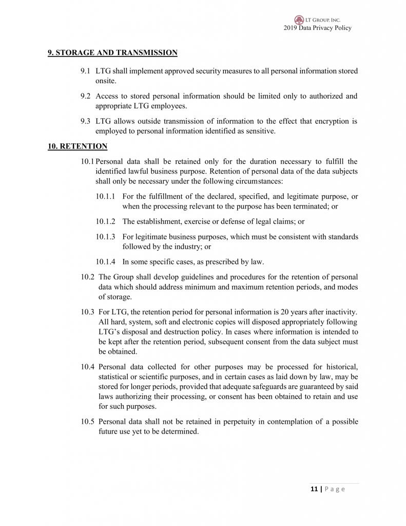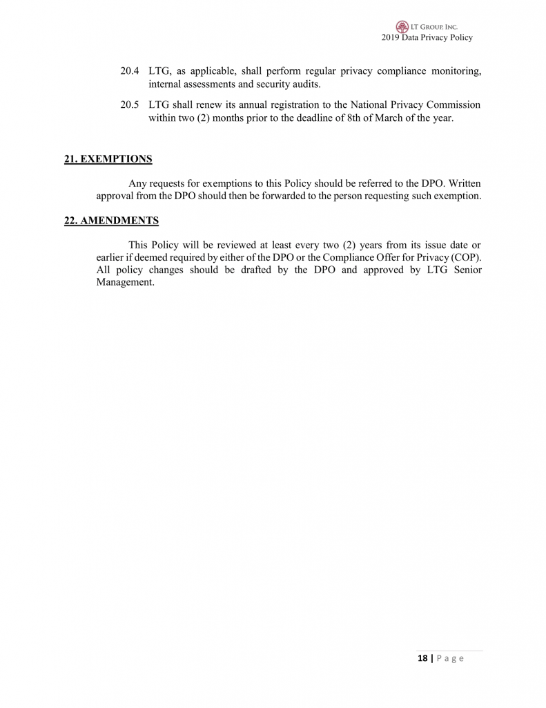 20.3 LTG shall perform regular review of its forms, contracts, policies and procedures pertaining to ensure compliance to Data Privacy.