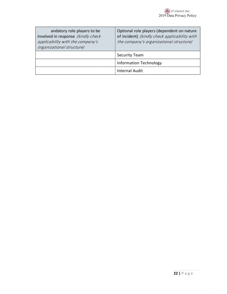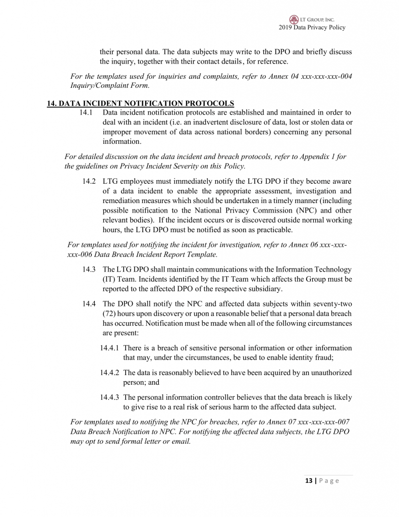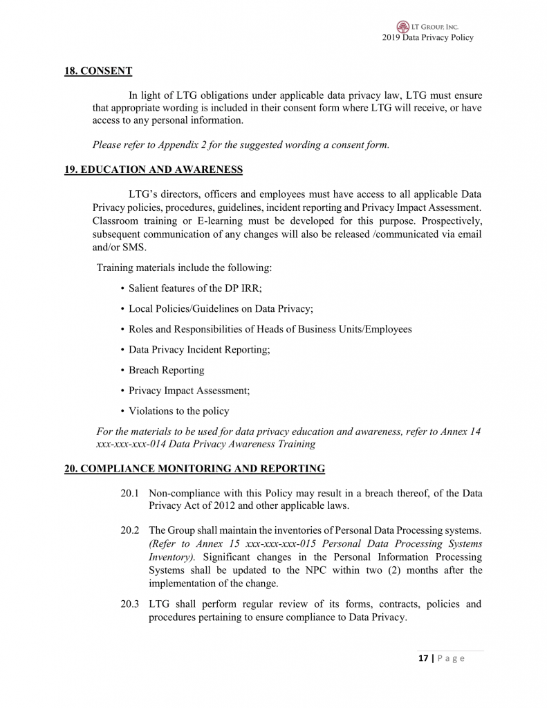 20.1 Non-compliance with this Policy may result in a breach thereof, of the Data Privacy Act of 2012 and other applicable laws.