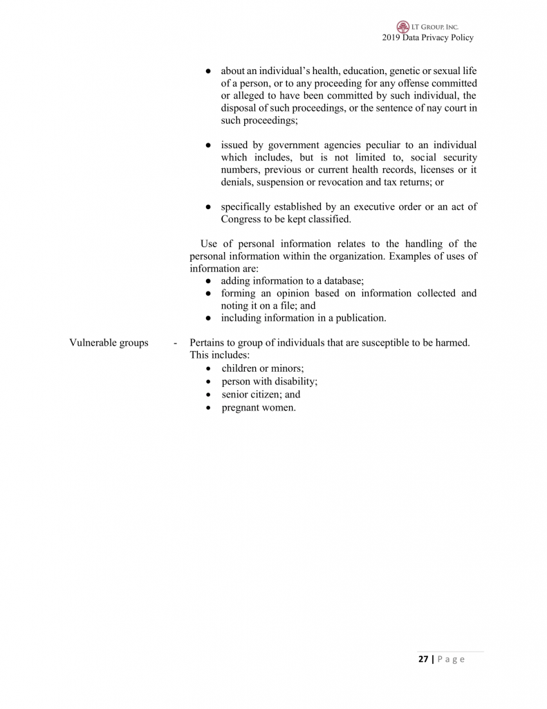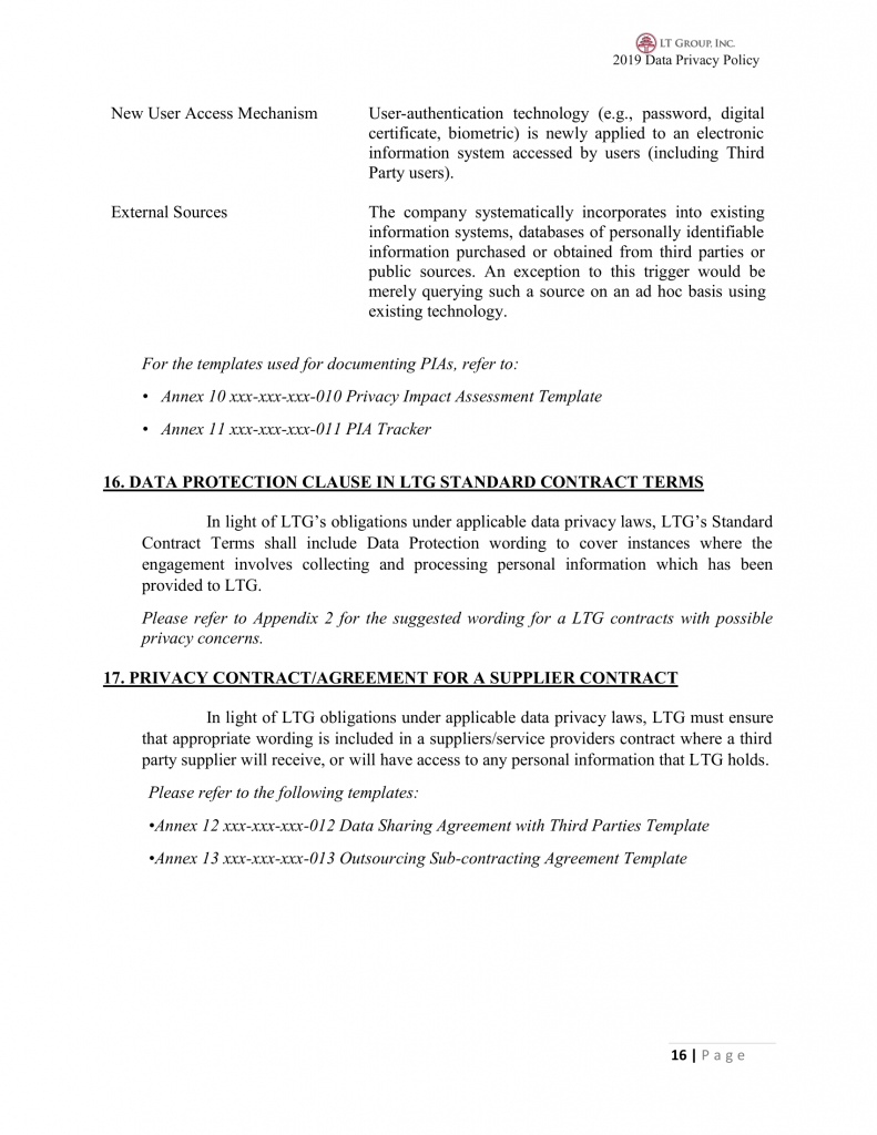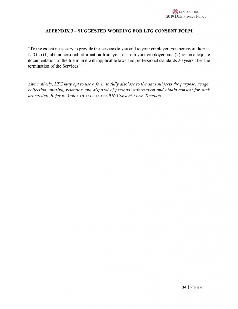 Alternatively, LTG may opt to use a form to fully disclose to the data subjects the purpose, usage, collection, sharing, retention and disposal of personal information and obtain consent for such processing. Refer to Annex 16 xxx-xxx-xxx-016 Consent Form Template.