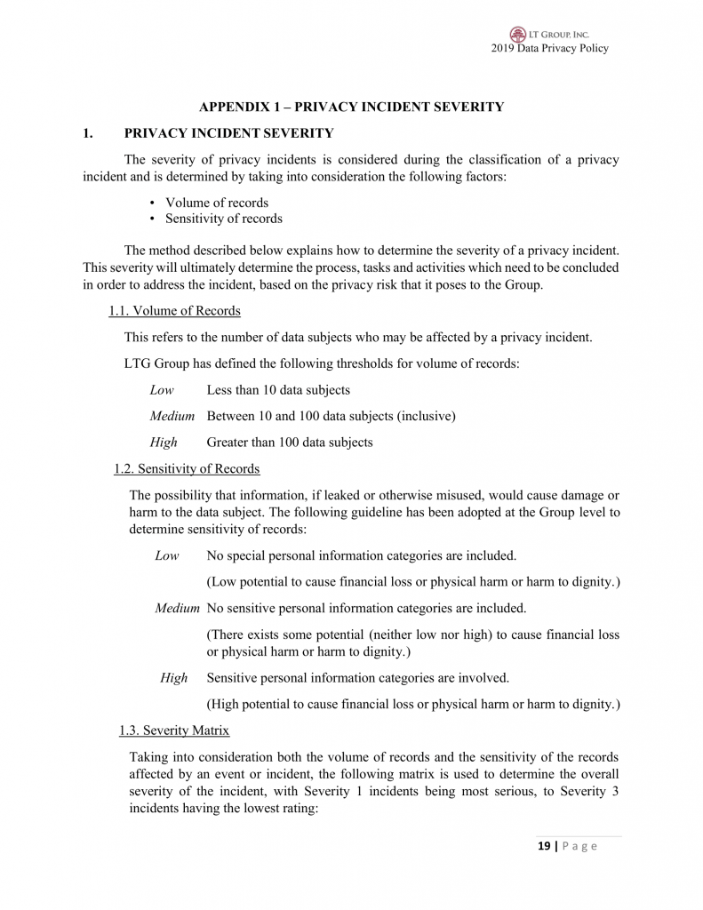 This refers to the number of data subjects who may be affected by a privacy incident. LTG Group has defined the following thresholds for volume of records:
