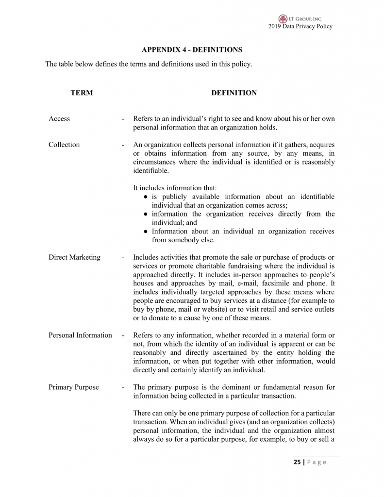 This Policy will be reviewed at least every two (2) years from its issue date or earlier if deemed required by either of the DPO or the Compliance Offer for Privacy (COP). All policy changes should be drafted by the DPO and approved by LTG Senior Management.