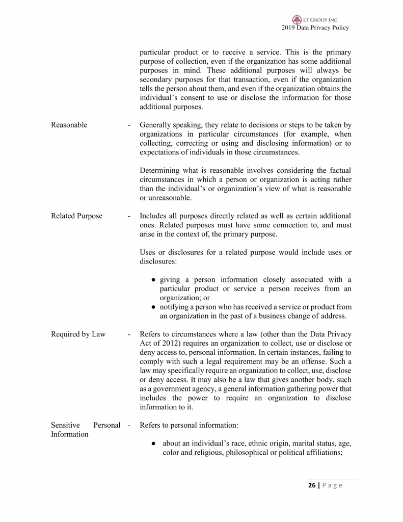 As a general rule, LTG employees must not use or disclose personal information about an individual other than for its primary purpose of collection, unless: