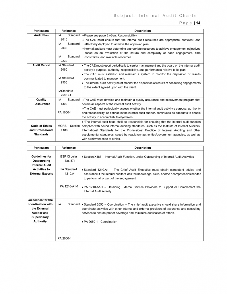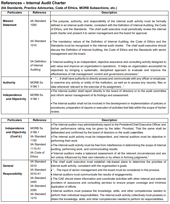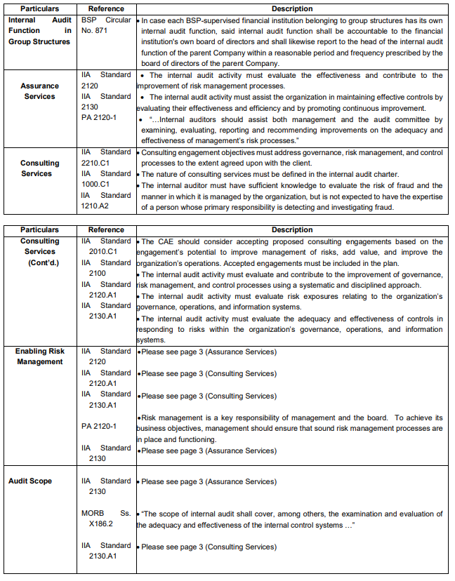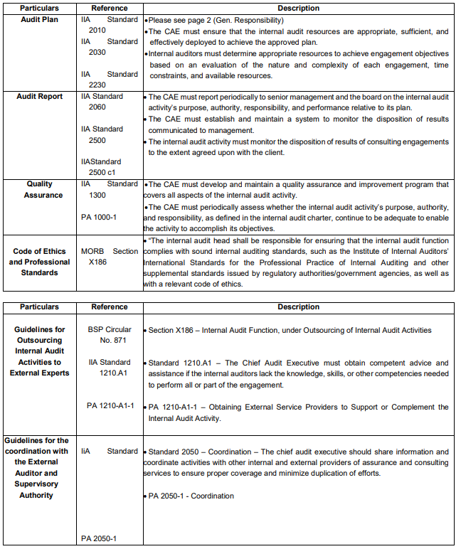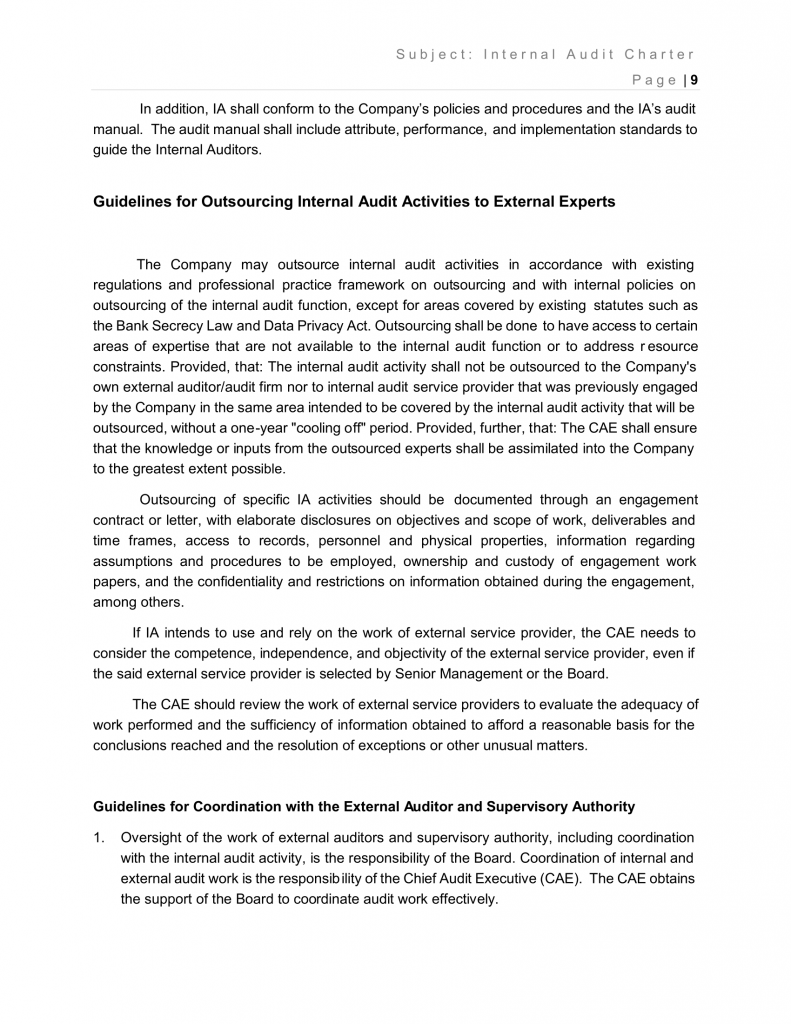 The Company may outsource internal audit activities in accordance with existing regulations and professional practice framework on outsourcing and with internal policies on outsourcing of the internal audit function, except for areas covered by existing statutes such as the Bank Secrecy Law and Data Privacy Act. Outsourcing shall be done to have access to certain areas of expertise that are not available to the internal audit function or to address resource constraints. Provided, that: The internal audit activity shall not be outsourced to the Company’s own external auditor/audit firm nor to internal audit service provider that was previously engaged by the Company in the same area intended to be covered by the internal audit activity that will be outsourced, without a one-year “cooling off” period. Provided, further, that: The CAE shall ensure that the knowledge or inputs from the outsourced experts shall be assimilated into the Company to the greatest extent possible.