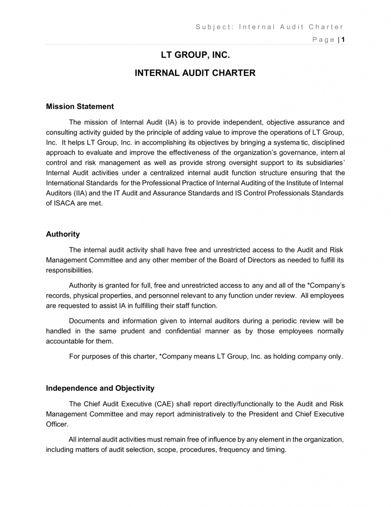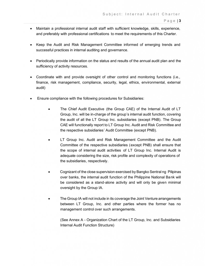 - The Chief Audit Executive (the Group CAE) of the Internal Audit of LT Group, Inc. will be in-charge of the group’s internal audit function, covering the audit of all the LT Group Inc. subsidiaries (except PNB). The Group CAE will functionally report to LT Group Inc. Audit and Risk Committee and the respective subsidiaries’ Audit Committee (except PNB).