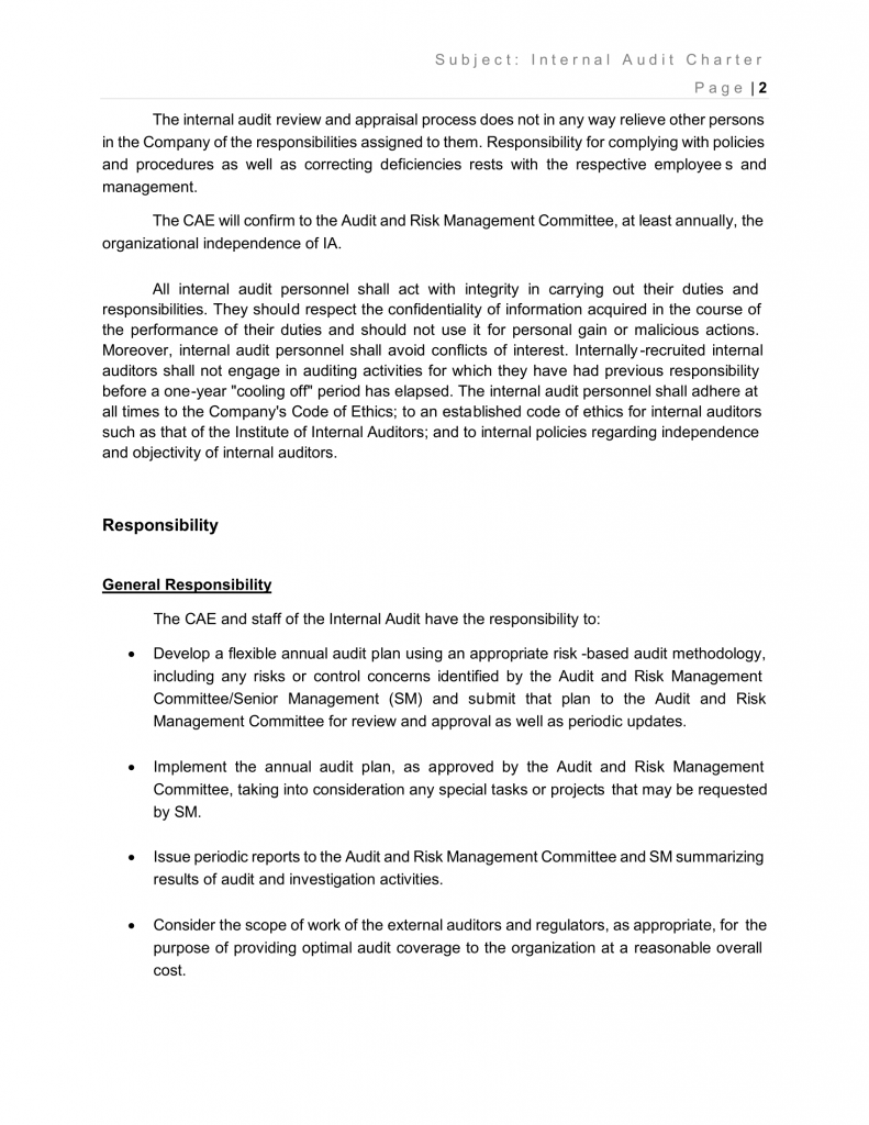 The CAE shall periodically assess whether the internal audit activity’s purpose, authority, and responsibility, as defined in the internal audit charter, continue to be adequate to enable the activity to accomplish its objectives. The results of this periodic assessment shall be communicated to the Audit and Risk Management Committee, the SM and the Board of Directors.