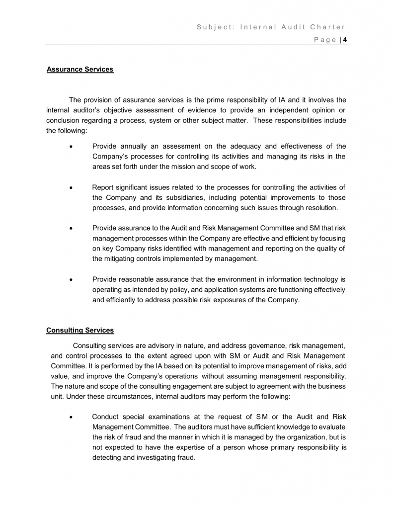 Consulting services are advisory in nature, and address governance, risk management, and control processes to the extent agreed upon with SM or Audit and Risk Management Committee. It is performed by the IA based on its potential to improve management of risks, add value, and improve the Company’s operations without assuming management responsibility. The nature and scope of the consulting engagement are subject to agreement with the business unit. Under these circumstances, internal auditors may perform the following: