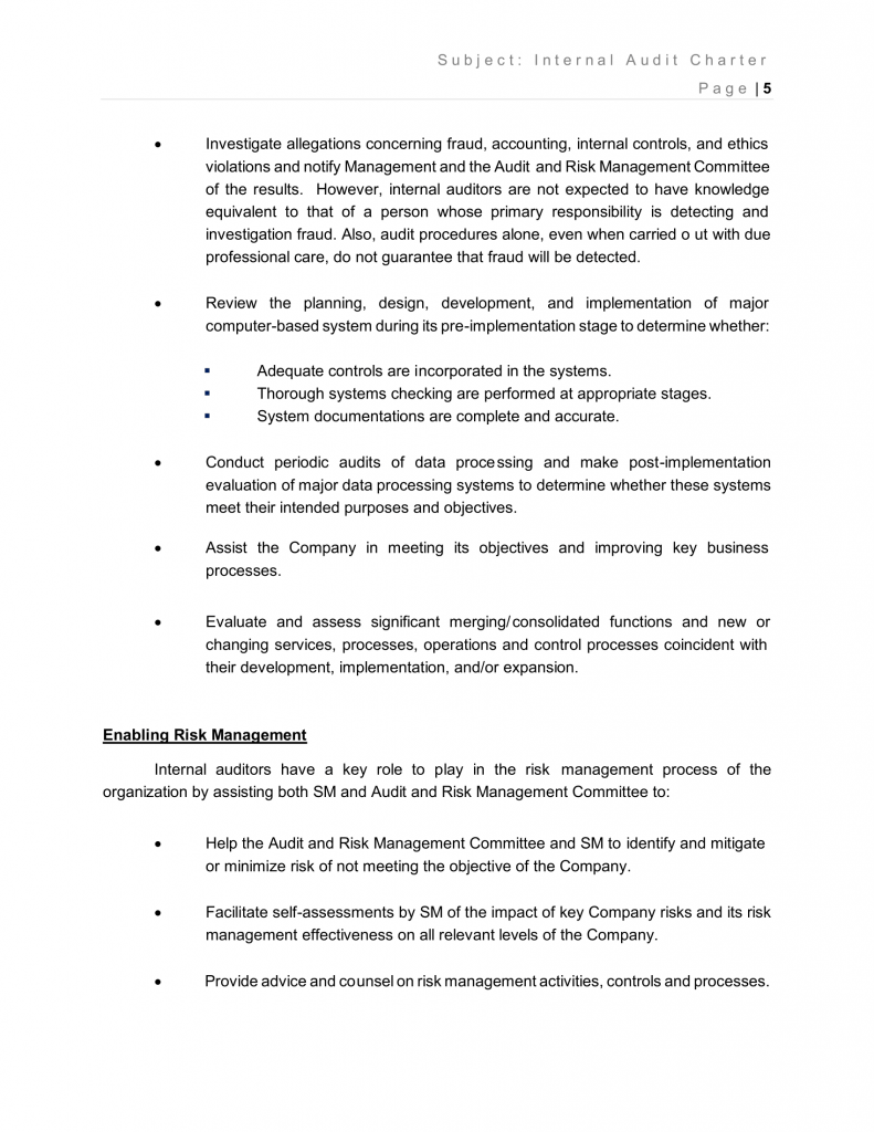 - Investigate allegations concerning fraud, accounting, internal controls, and ethics violations and notify Management and the Audit and Risk Management Committee of the results. However, internal auditors are not expected to have knowledge equivalent to that of a person whose primary responsibility is detecting and investigation fraud. Also, audit procedures alone, even when carried out with due professional care, do not guarantee that fraud will be detected.