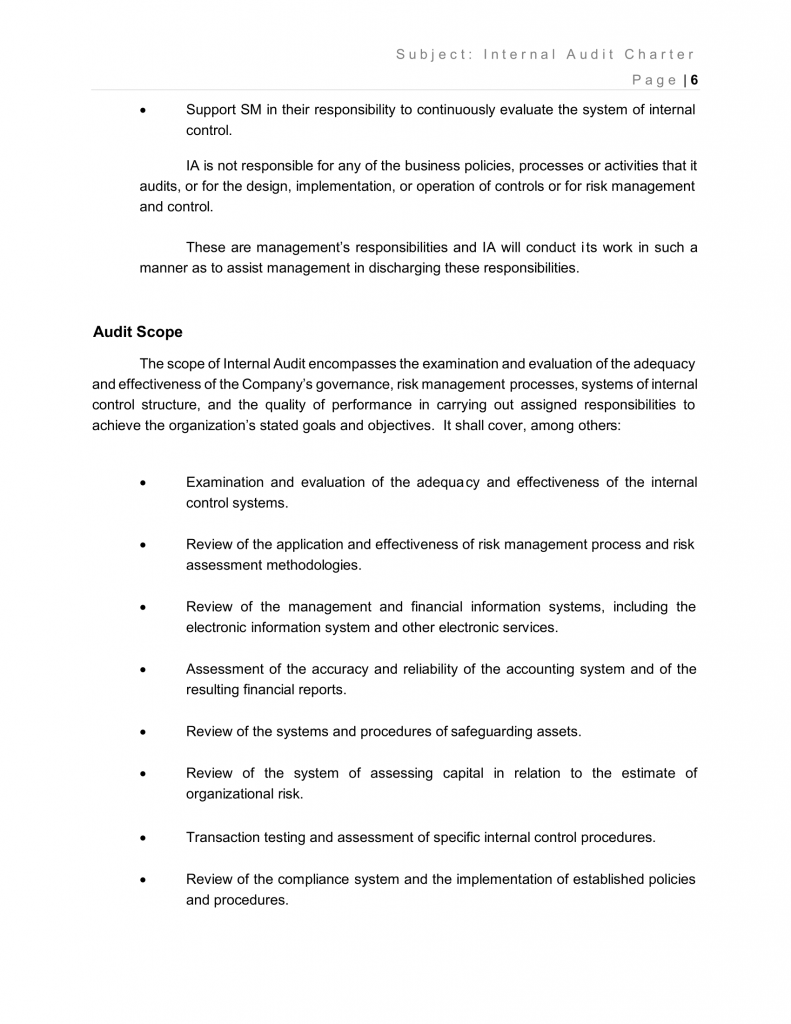 The scope of Internal Audit encompasses the examination and evaluation of the adequacy and effectiveness of the Company’s governance, risk management processes, systems of internal control structure, and the quality of performance in carrying out assigned responsibilities to achieve the organization’s stated goals and objectives. It shall cover, among others: