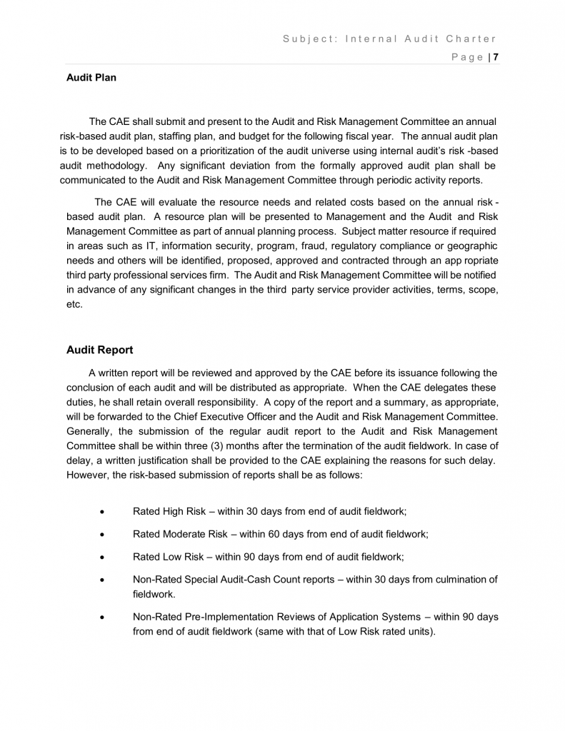 A written report will be reviewed and approved by the CAE before its issuance following the conclusion of each audit and will be distributed as appropriate. When the CAE delegates these duties, he shall retain overall responsibility. A copy of the report and a summary, as appropriate, will be forwarded to the Chief Executive Officer and the Audit and Risk Management Committee. Generally, the submission of the regular audit report to the Audit and Risk Management Committee shall be within three (3) months after the termination of the audit fieldwork. In case of delay, a written justification shall be provided to the CAE explaining the reasons for such delay. However, the risk-based submission of reports shall be as follows: