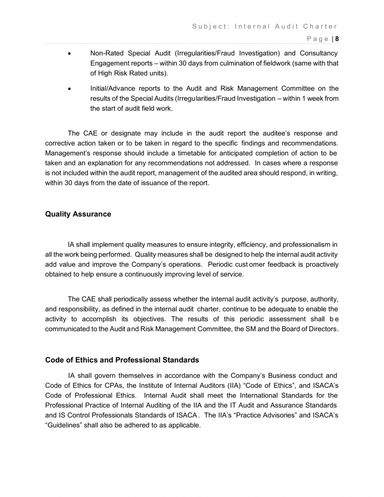 IA shall govern themselves in accordance with the Company’s Business conduct and Code of Ethics for CPAs, the Institute of Internal Auditors (IIA) “Code of Ethics”, and ISACA’s Code of Professional Ethics. Internal Audit shall meet the International Standards for the Professional Practice of Internal Auditing of the IIA and the IT Audit and Assurance Standards and IS Control Professionals Standards of ISACA. The IIA’s “Practice Advisories” and ISACA’s “Guidelines” shall also be adhered to as applicable.