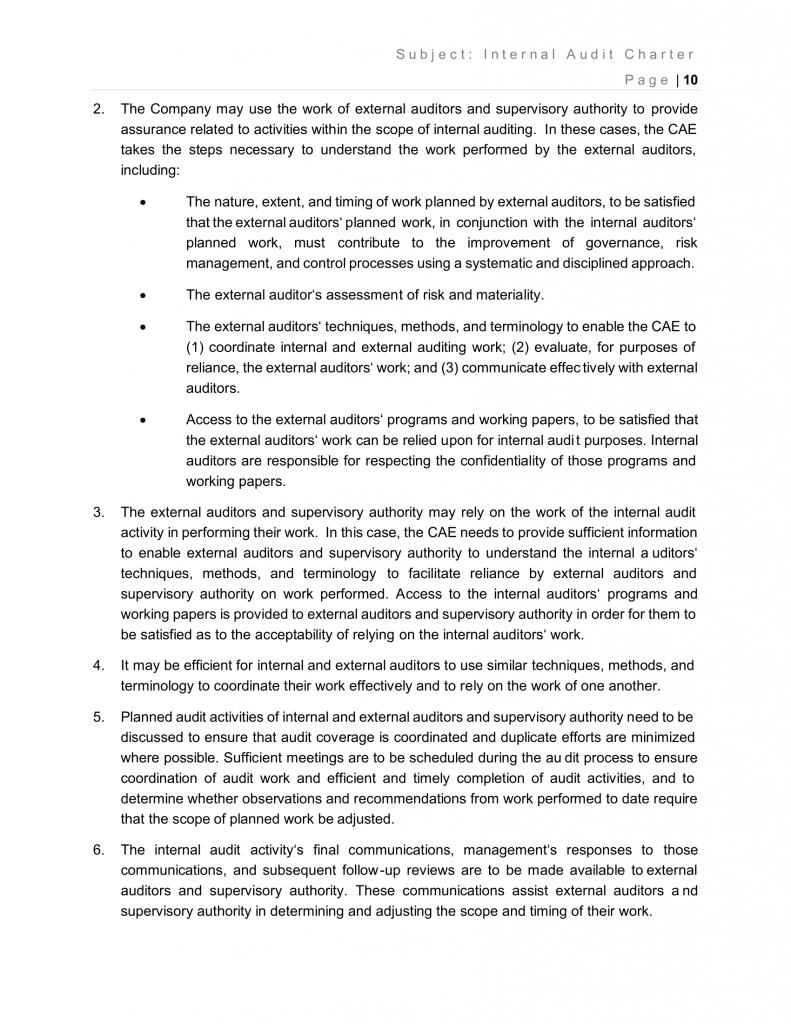 - The Company may use the work of external auditors and supervisory authority to provide assurance related to activities within the scope of internal auditing. In these cases, the CAE takes the steps necessary to understand the work performed by the external auditors, including: