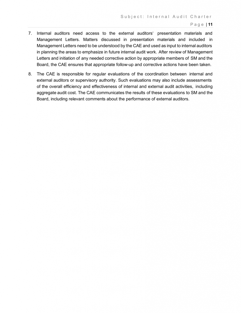 - The CAE is responsible for regular evaluations of the coordination between internal and external auditors or supervisory authority. Such evaluations may also include assessments of the overall efficiency and effectiveness of internal and external audit activities, including aggregate audit cost. The CAE communicates the results of these evaluations to SM and the Board, including relevant comments about the performance of external auditors.