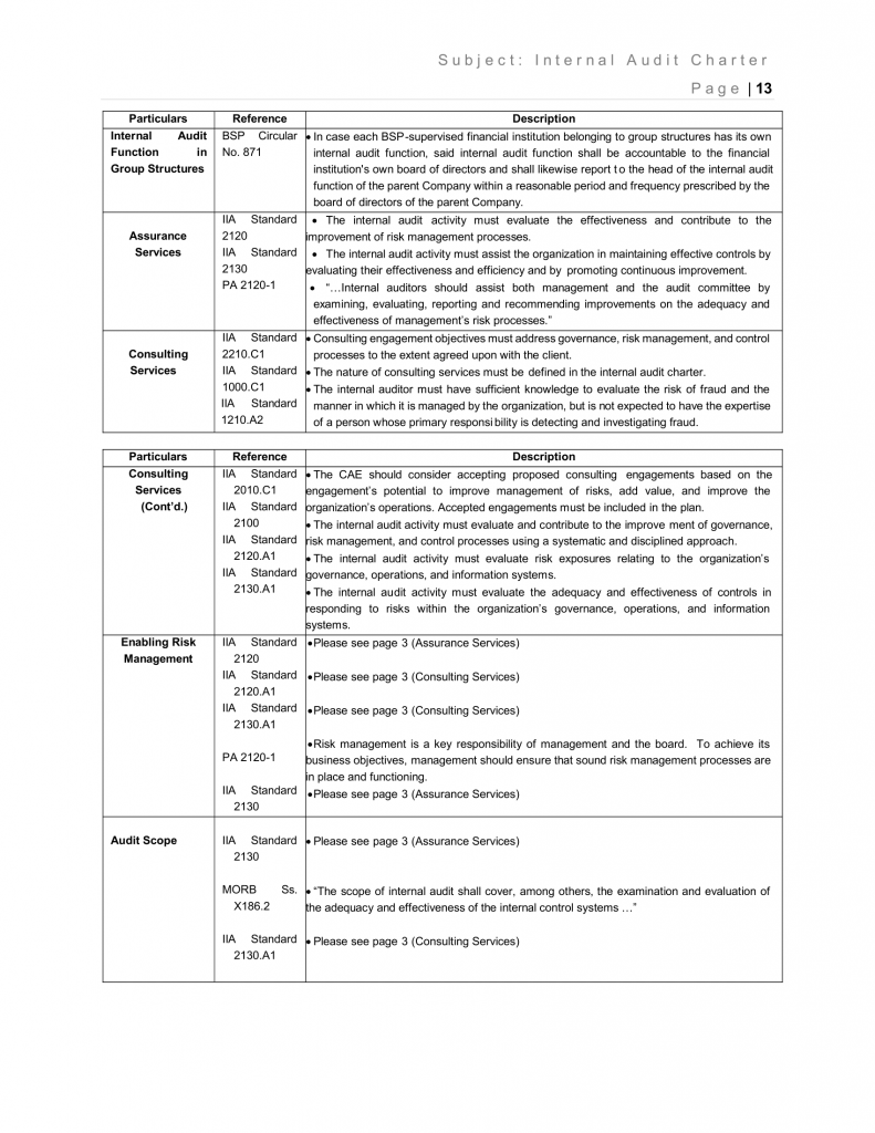 - Cognizant of the close supervision exercised by Bangko Sentral ng Pilipinas over banks, the internal audit function of the Philippine National Bank will be considered as a stand-alone activity and will only be given minimal oversight by the Group IA.
